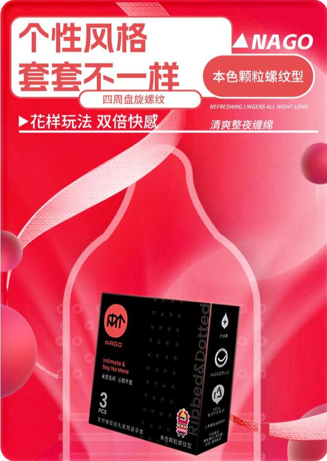 NAGO避孕套开口端为卷边,顶端带贮精囊,以避孕为目的且有助手防止性传播疾病的男性用具。